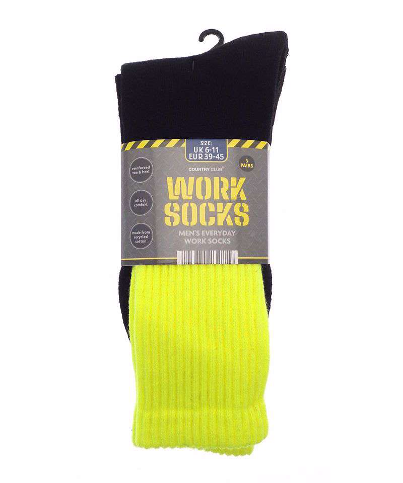 Pack of 3 men’s everyday work socks. Made from polyester and recycled cotton. Reinforced toe and heel for all-day comfort.